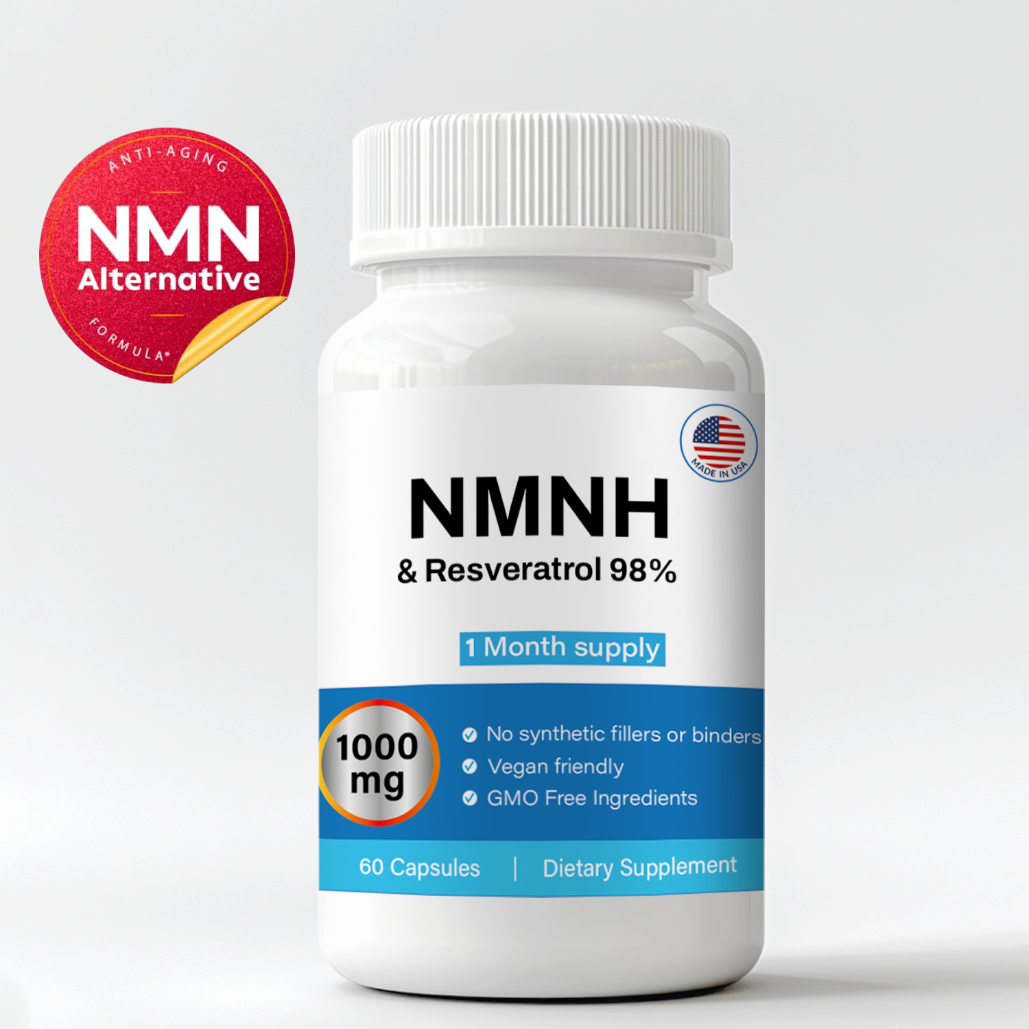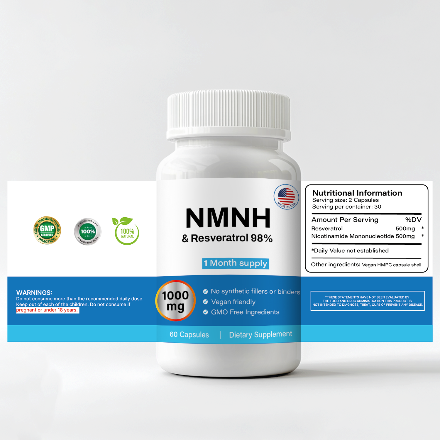 - 1000 mg per serving (500 mg NMNH + 500 mg Resveratrol)